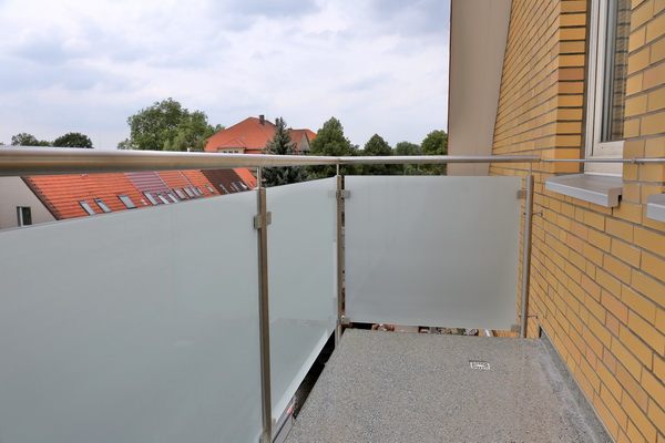 Edelstahlgeländer mit matter Glasfüllung.
