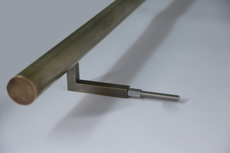 Die Handlaufträger sind Wasserstrahlgeschnitten, geschliffen und brüniert. Das Bohrloch wir mit einer Bronzescheibe abgedeckt.