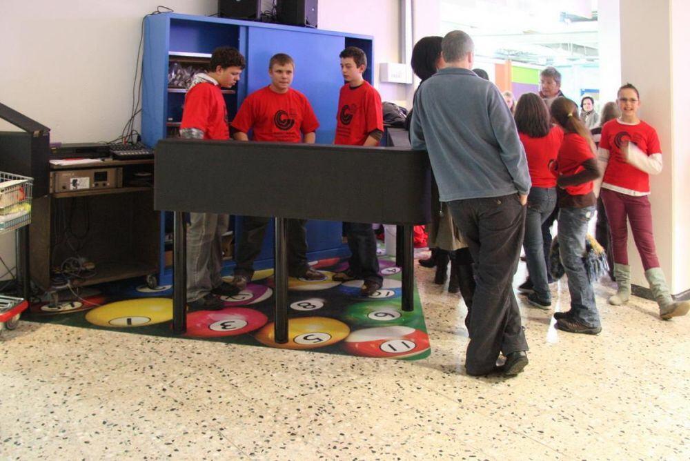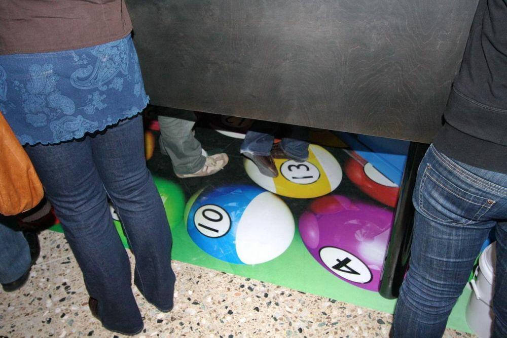 Die Spielgeräteausgabe mit einem Tresen als Billard Triangel und gedruckte Billardkugeln als Fußboden.