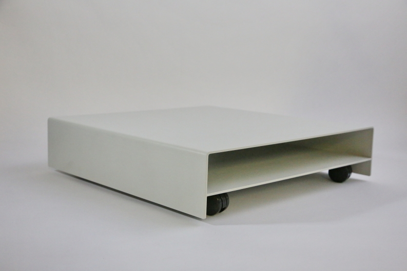Druckerwagen Größe ca.: Höhe 110 mm x Breite 455 mm x Tiefe 460 mm gefertigt aus 3 mm fabrikneuem Stahlblech S235JR mit vier Rollen alle Stahlteile in RAL 7035 pulverbeschichtet inkl. Planung, Konstruktion und Fertigung