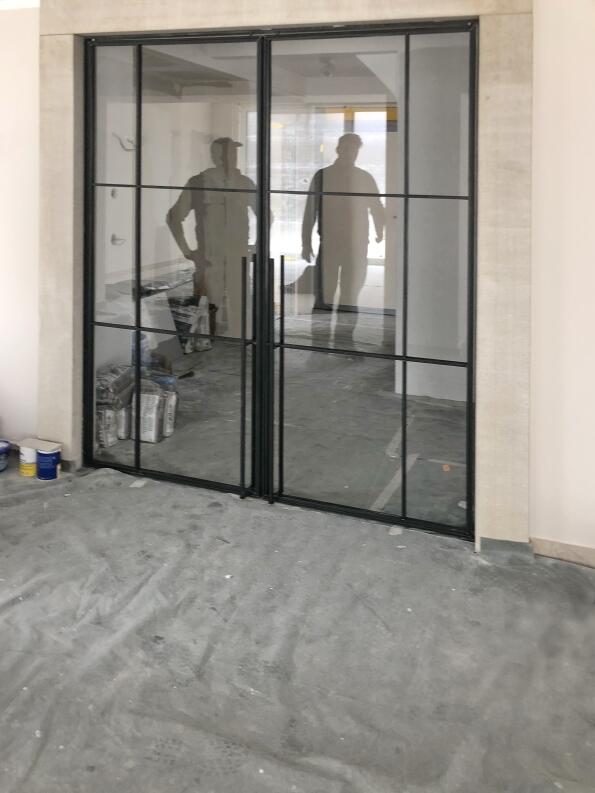 Durchschwingende Doppeltür im Industrie-Loft-Look mit Pivot Beschlägen und Nord-Südpol Magneten zur Nullstellung.