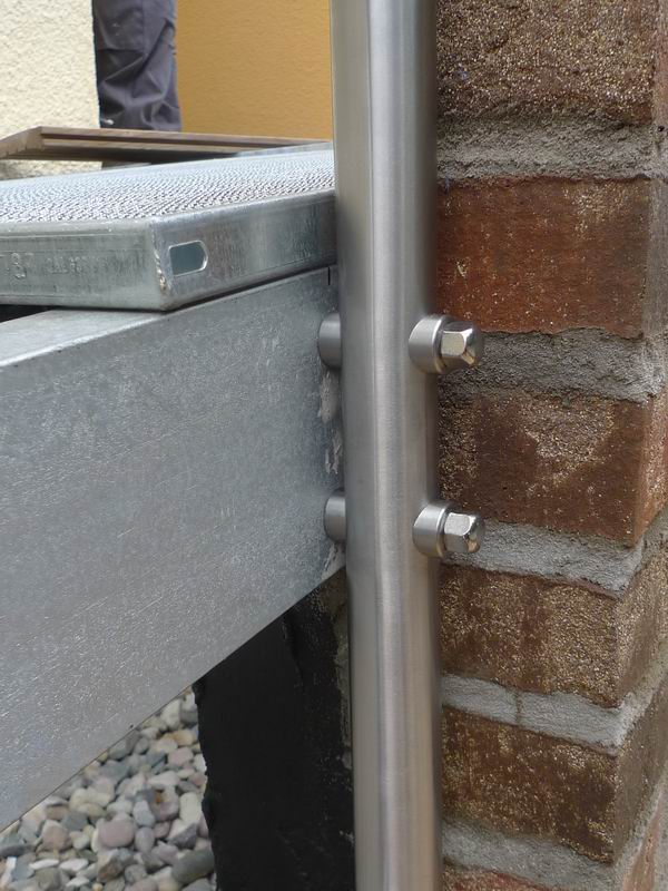 Ein Handlauf aus Edelstahlrohr gibt zusätzlich gehbehinderten Menschen die Möglichkeit, sicher nach oben zu kommen. Horizontal verlaufende Relingstäbe mit einem einen Durchmesser von 12 mm runden das Gesamtbild ab.