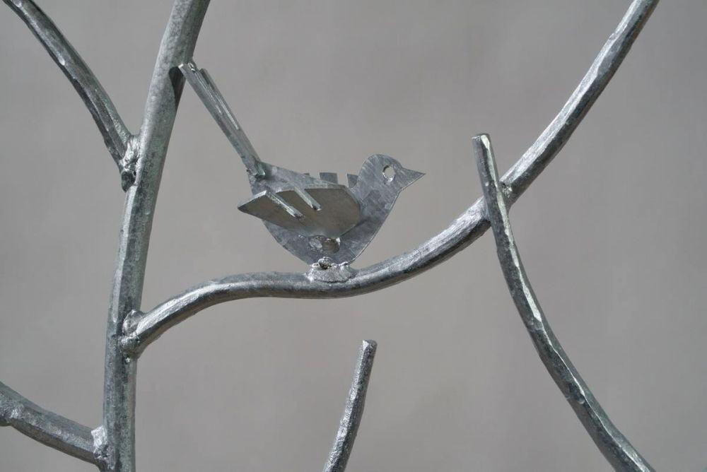Die gelaserten Vögel sitzen auf geschmiedeten Ästen.