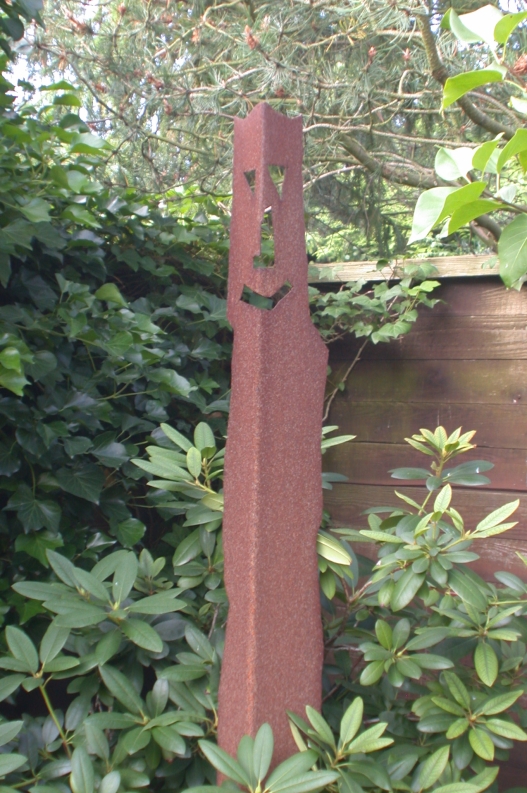Unten an die Skulpturen werden 2 angespitzte Rundeisen geschweißt, damit man die Bleche in die Erde stecken kann.