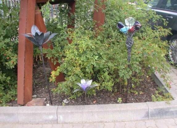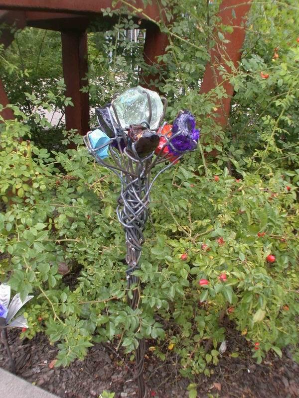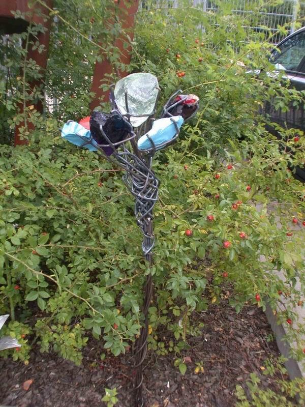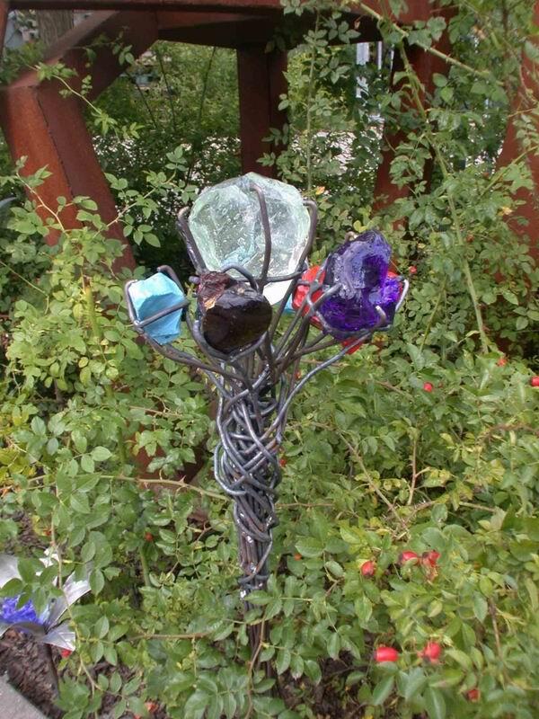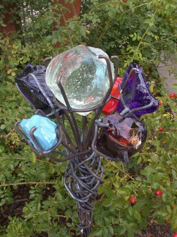 Skulpturale Blume in Verbindung von Eisen und Farbglas.