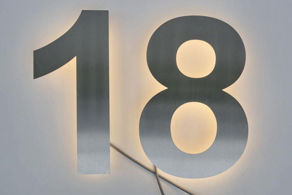 Aus Edelstahl gelaserte LED Hausnummer "18".