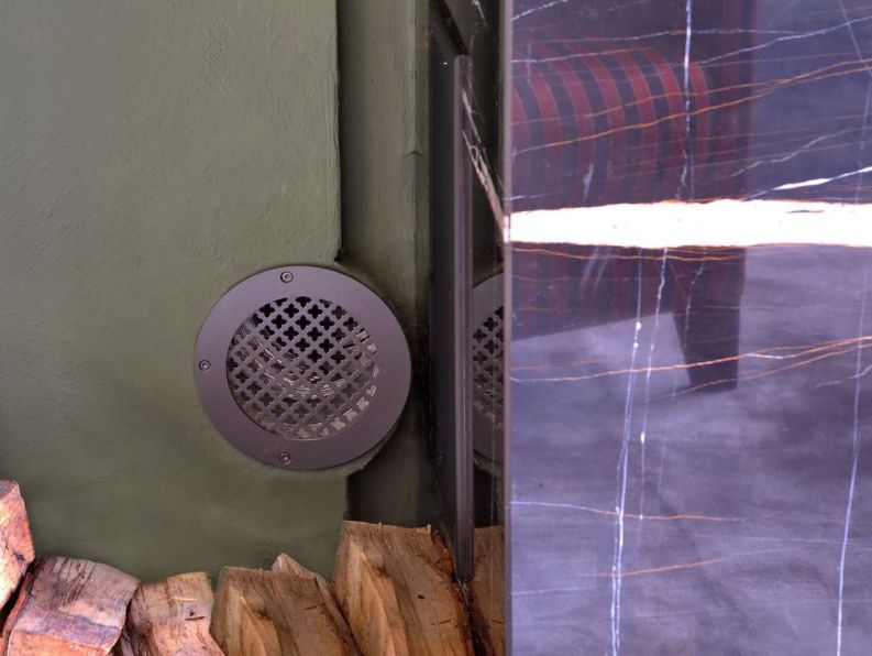Rundes Lüftungsgitter für einen Kamin in einer historischen Orangerie.