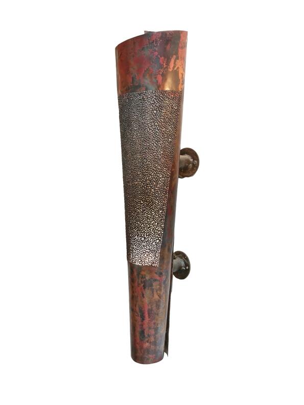 Die Wandleuchte Perfora I ist ein kraftvolles Zusammenspiel aus Material, Feuer und Licht. Aus 0,8 mm starkem Kupferblech geformt, erhält sie ihre charakteristische Oberfläche durch einen unmittelbaren, beinahe archaischen Prozess: Mit dem Schweißbrenner werden unzählige Öffnungen in das Metall gebrannt – jede einzelne ein zufälliges Ereignis, jede Fläche ein Unikat.