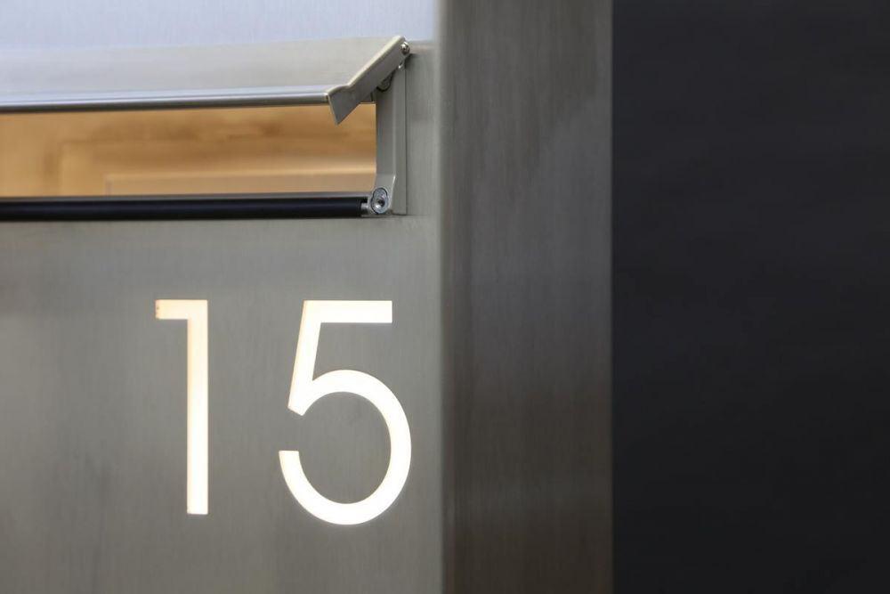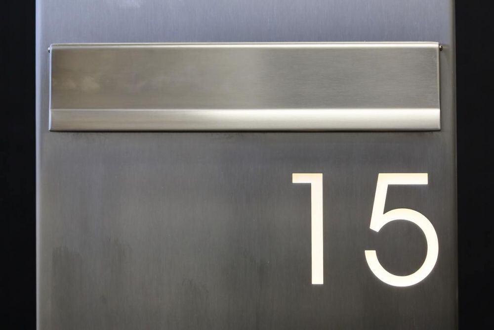 Die ausgelaserte Hausnummer „15“, ist mit Acrylglas hinterlegt und mit LED´s illuminiert,
