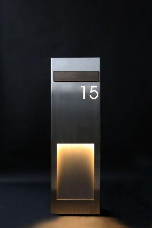 Stilvolle Briefkastensäule mit hinterleuchteter Hausnummer, und einem Licht- und Zeitungsfach.