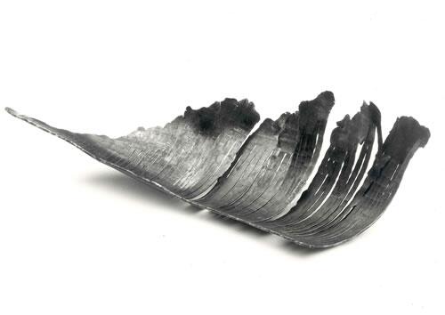 Anschließend wird die Schale zu einer Blattform geschmiedet. Länge der Schalenskulptur ca. 20 cm. Die oberste Eisenschicht verbrennt im Feuer, es bildet sich eine sogenannte Zunderschicht. Diese hat eine fast schwarze Farbe mit einem Anteil an Blautönen. Die Arbeit ist mit einem speziellem, sehr matten Klarlack, vor Rost geschützt.