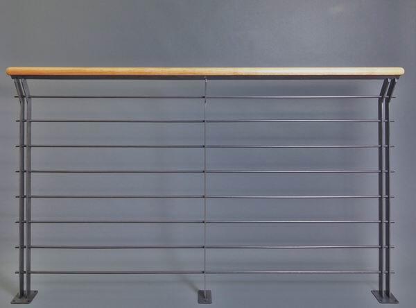 Brüstungsgeländer aus verzundertem Flachstahl mit Eichenhandlauf,