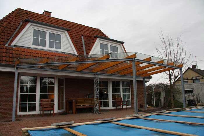 Terrassenüberdachung ist freistehend und hat keine Verbindung zum Haus. Sie hat in diesem Fall ein Gefälle zur Dachrinne hin. So wird elegant und ohne großen Aufwand über die Dachrinne des Hausdaches entwässert.