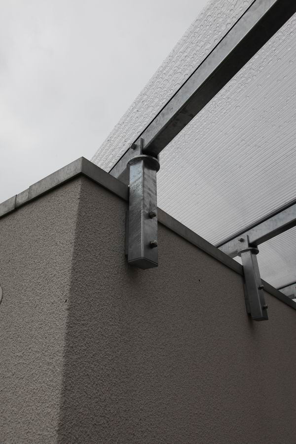 Die Unterkonstruktion besteht aus feuerverzinktem Material, die Bedeckung aus durchsichtiger Doppelstegplatte.
