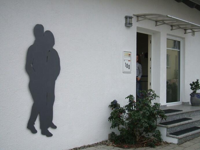 Die Skulptur ist mit nicht sichtbaren Halterungen an der Wand befestigt.