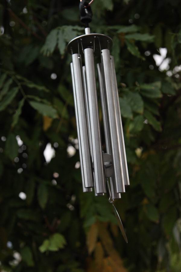 Das Windspiel bewegtsich sanft im Wind und gibt leise Töne wieder.