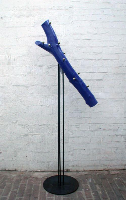 ein lackierter Baumstamm in Ultramarinblau auf einem Stahlgestehl.